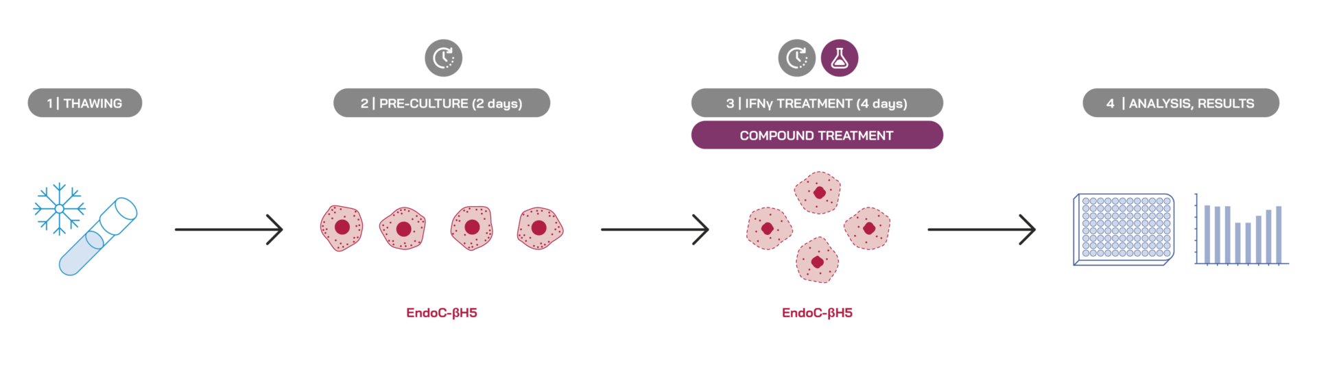 Inflammation is a major and complex component of pathogenic processes in type 1 and type 2 diabetes mellitus. In type 1 diabetes, inflammation is a primary event that persists and intensifies as the disease progresses, whereas in type 2 diabetes, inflammation is a chronic feature. In both types of diabetes, the phenomenon involves inflammatory cytokines and is responsible for impaired insulin secretion and the destruction of pancreatic beta cells, making it a central strategy for drug discovery activities targeting Diabetes. Using Endoc-βH5® cells, this assay reproduces the clinically observed response of human pancreatic beta cells to cytokine-induced inflammation. It enables you to assess the pharmacological efficacy of your drug discovery strategies aiming to modulate inflammatory response and protect beta cells from inflammation.