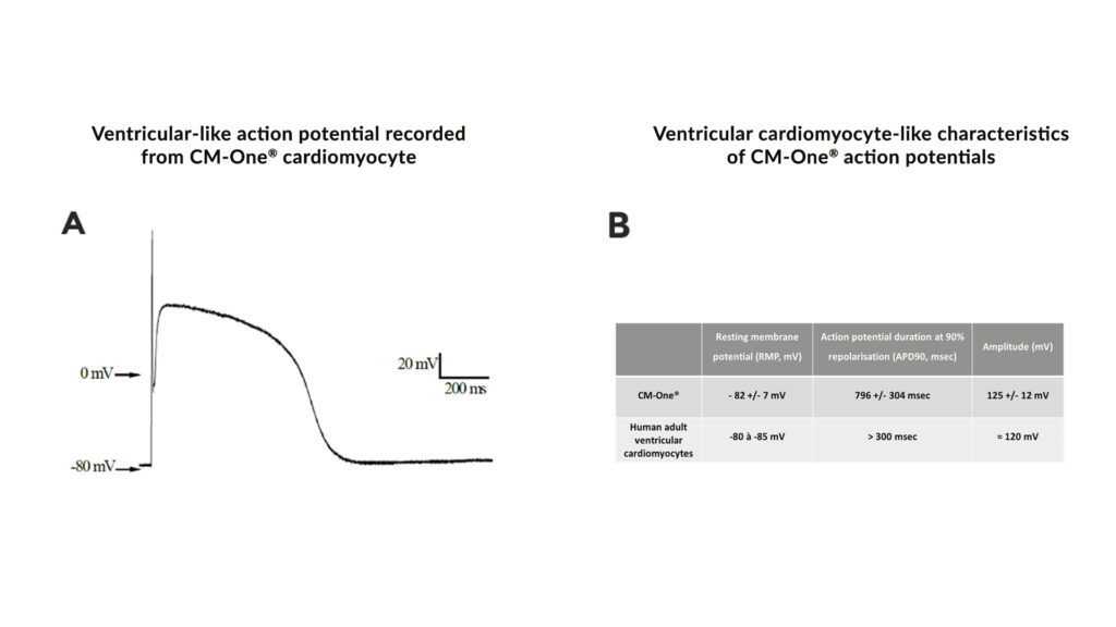 Action potential (AP) fired by CM-One® cardiomyocytes display features of human ventricular cardiomyocyte AP. AP recording from CM-One® cardiomyocytes measured in whole-cell patch clamp experiment (A) and AP parameters (B) showed adult human ventricular cardiomyocyte-like characteristics.