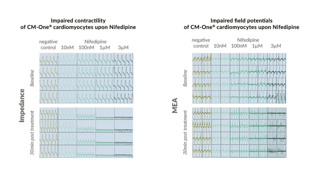 CM-One® cardiomyocytes show impaired contractility and field potentials upon Nifedipine treatment in impedance and MEA recording. Nifedipine treatment reduces contractility and field potential duration of CM-One® cardiomyocytes, as shown by impedance and MEA measurements using the xCELLigence RTCA CardioECR system.