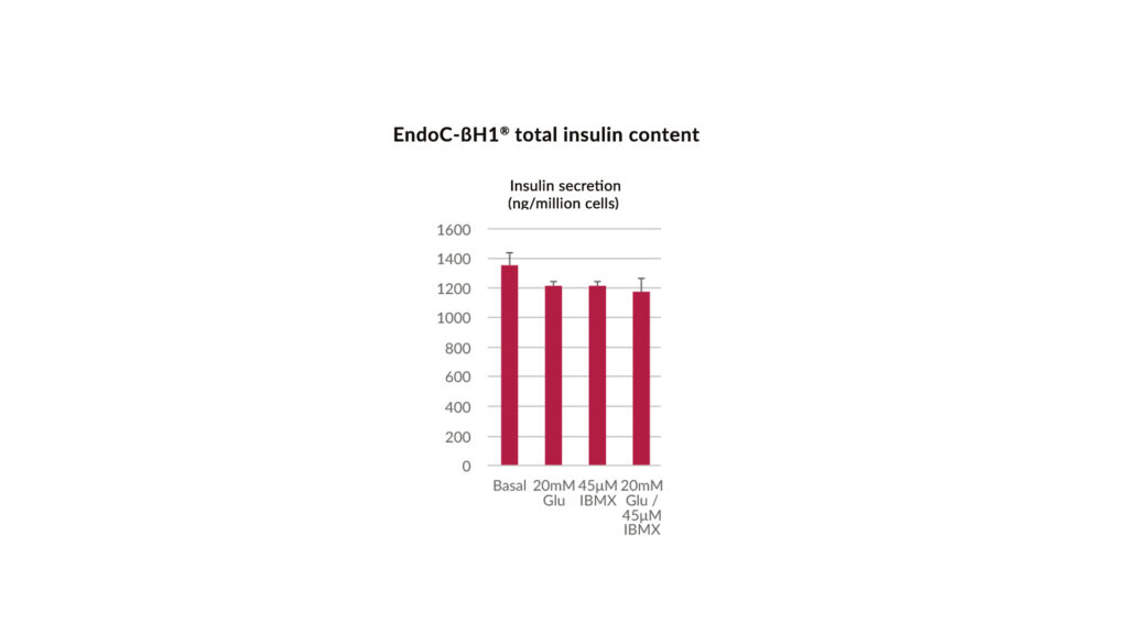 This high-quality human pancreatic beta cell line displays a homogeneity that exceeds 99% and an insulin content of 0.5 to 1 µg/million cells. Functionality of EndoC-βH1® cells has been validated using glucose stimulated insulin secretion (GSIS) assay. Our production and assay processes are conducted with rigor and precision, in full respect of the industry’s highest quality standards for reliability and reproducibility. Below are the technical data of EndoC-βH1® characteristics.
