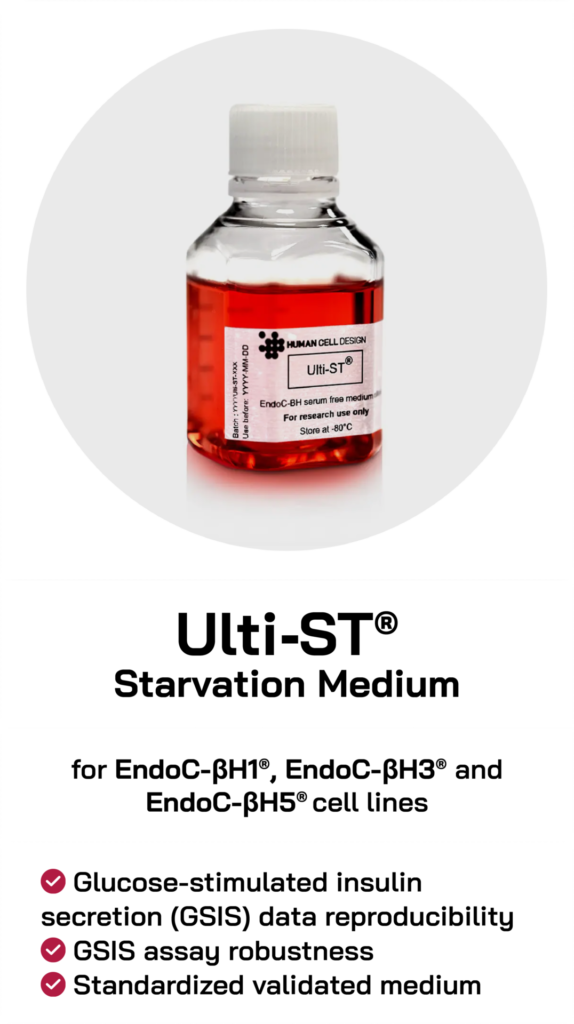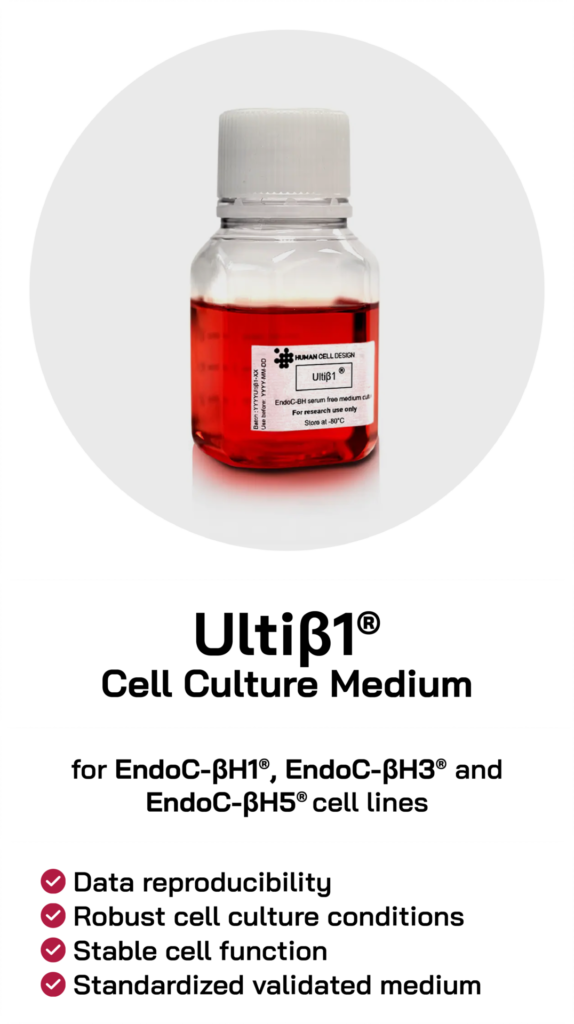 Human Cell Design optimized their pancreatic Beta cell culture media, Ultiβ1® medium and Ulti-ST® starvation medium. Originally dedicated to only EndoC-βH5®, they are now fully adapted to EndoC-βH1®, EndoC-βH3® and EndoC-βH5® beta cell lines. These new versions have been specially designed to offer you enhanced cell culture stability, data reliability and optimal robustness during the starvation step.